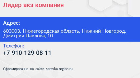 Лидер-акз, компания по адресу 603003, Нижегородская область, Нижний Новгород, Дмитрия Павлова, 10 в дальнейшем Организация, размещена в следующих категориях: