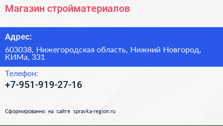Магазин стройматериалов по адресу 603038, Нижегородская область, Нижний Новгород, КИМа, 331 в дальнейшем Организация, размещена в следующих категориях: