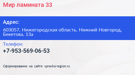Мир ламината 33 по адресу 603057, Нижегородская область, Нижний Новгород, Бекетова, 13а в дальнейшем Организация, размещена в следующих категориях:
