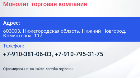 Монолит, торговая компания по адресу 603003, Нижегородская область, Нижний Новгород, Коминтерна, 117 в дальнейшем Организация, размещена в следующих категориях: