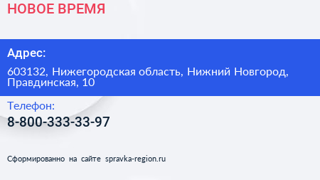 НОВОЕ ВРЕМЯ по адресу 603132, Нижегородская область, Нижний Новгород, Правдинская, 10 в дальнейшем Организация, размещена в следующих категориях: