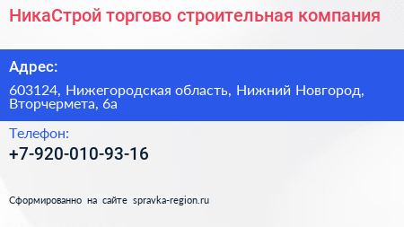 НикаСтрой, торгово-строительная компания по адресу 603124, Нижегородская область, Нижний Новгород, Вторчермета, 6а в дальнейшем Организация, размещена в следующих категориях: