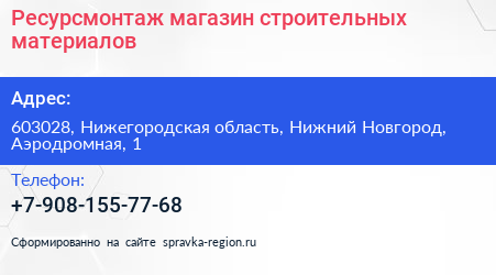 Ресурсмонтаж, магазин строительных материалов по адресу 603028, Нижегородская область, Нижний Новгород, Аэродромная, 1 в дальнейшем Организация, размещена в следующих категориях:
