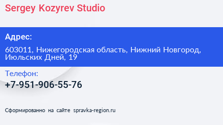 Sergey Kozyrev Studio по адресу 603011, Нижегородская область, Нижний Новгород, Июльских Дней, 19 в дальнейшем Организация, размещена в следующих категориях: