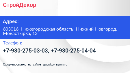 СтройДекор по адресу 603016, Нижегородская область, Нижний Новгород, Монастырка, 13 в дальнейшем Организация, размещена в следующих категориях: