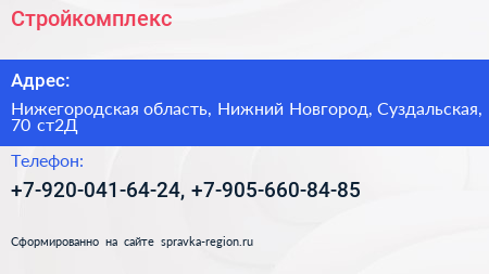 Стройкомплекс по адресу Нижегородская область, Нижний Новгород, Суздальская, 70 ст2Д в дальнейшем Организация, размещена в следующих категориях: