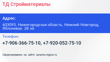ТД Стройматериалы по адресу 603093, Нижегородская область, Нижний Новгород, Яблоневая, 28 к6 в дальнейшем Организация, размещена в следующих категориях: