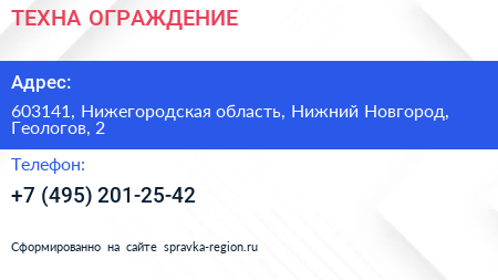 ТЕХНА ОГРАЖДЕНИЕ по адресу 603141, Нижегородская область, Нижний Новгород, Геологов, 2 в дальнейшем Организация, размещена в следующих категориях: