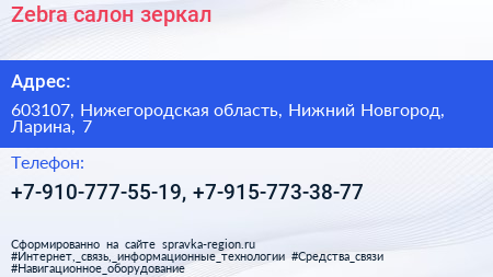 Zebra, салон зеркал по адресу 603107, Нижегородская область, Нижний Новгород, Ларина, 7 в дальнейшем Организация, размещена в следующих категориях: