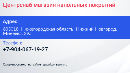 Центрснаб, магазин напольных покрытий по адресу 603018, Нижегородская область, Нижний Новгород, Минеева, 29а в дальнейшем Организация, размещена в следующих категориях: