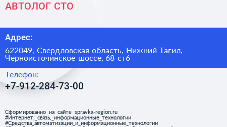 АВТОЛОГ, СТО по адресу 622049, Свердловская область, Нижний Тагил, Черноисточинское шоссе, 68 ст6 в дальнейшем Организация, размещена в следующих категориях: