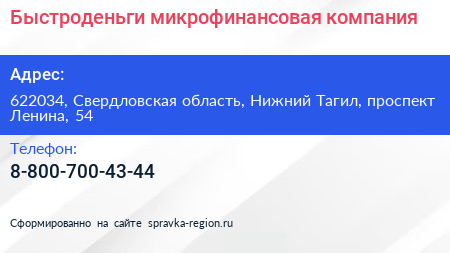 Быстроденьги, микрофинансовая компания по адресу 622034, Свердловская область, Нижний Тагил, проспект Ленина, 54 в дальнейшем Организация, размещена в следующих категориях:
