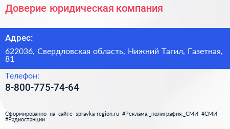 Доверие, юридическая компания по адресу 622036, Свердловская область, Нижний Тагил, Газетная, 81 в дальнейшем Организация, размещена в следующих категориях: