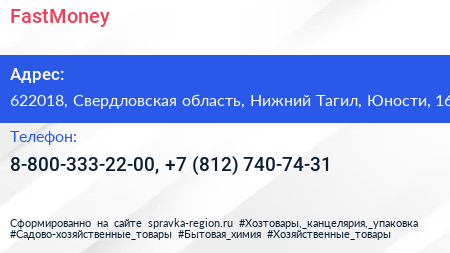 FastMoney по адресу 622018, Свердловская область, Нижний Тагил, Юности, 16 в дальнейшем Организация, размещена в следующих категориях: