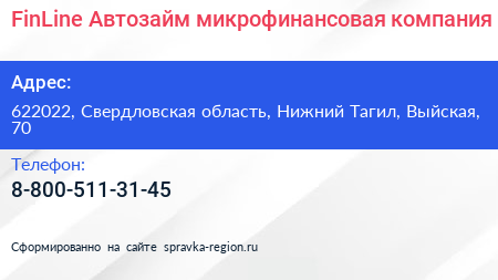 FinLine-Автозайм, микрофинансовая компания по адресу 622022, Свердловская область, Нижний Тагил, Выйская, 70 в дальнейшем Организация, размещена в следующих категориях: