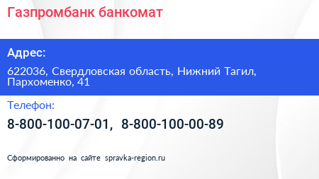 Газпромбанк, банкомат по адресу 622036, Свердловская область, Нижний Тагил, Пархоменко, 41 в дальнейшем Организация, размещена в следующих категориях: