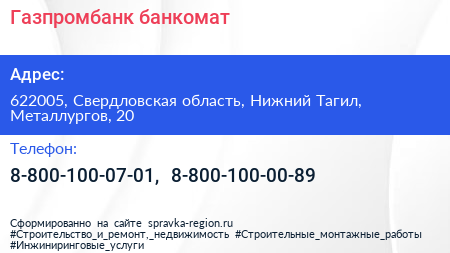 Газпромбанк, банкомат по адресу 622005, Свердловская область, Нижний Тагил, Металлургов, 20 в дальнейшем Организация, размещена в следующих категориях: