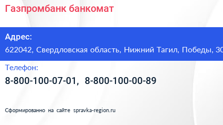 Газпромбанк, банкомат по адресу 622042, Свердловская область, Нижний Тагил, Победы, 30 в дальнейшем Организация, размещена в следующих категориях: