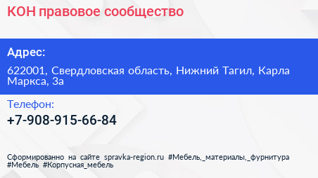 КОН, правовое сообщество по адресу 622001, Свердловская область, Нижний Тагил, Карла Маркса, 3а в дальнейшем Организация, размещена в следующих категориях: