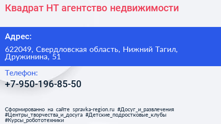Квадрат-НТ, агентство недвижимости по адресу 622049, Свердловская область, Нижний Тагил, Дружинина, 51 в дальнейшем Организация, размещена в следующих категориях: