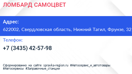 ЛОМБАРД САМОЦВЕТ по адресу 622002, Свердловская область, Нижний Тагил, Фрунзе, 32 в дальнейшем Организация, размещена в следующих категориях: