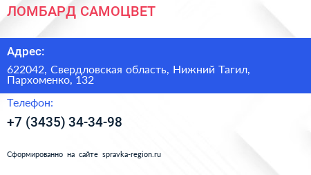 ЛОМБАРД САМОЦВЕТ по адресу 622042, Свердловская область, Нижний Тагил, Пархоменко, 132 в дальнейшем Организация, размещена в следующих категориях: