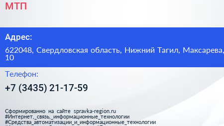МТП по адресу 622048, Свердловская область, Нижний Тагил, Максарева, 10 в дальнейшем Организация, размещена в следующих категориях: