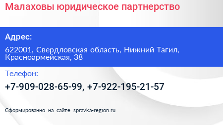 Малаховы, юридическое партнерство по адресу 622001, Свердловская область, Нижний Тагил, Красноармейская, 38 в дальнейшем Организация, размещена в следующих категориях: