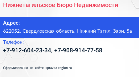 Нижнетагильское Бюро Недвижимости по адресу 622052, Свердловская область, Нижний Тагил, Зари, 5а в дальнейшем Организация, размещена в следующих категориях: