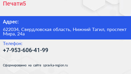 Печати5 по адресу 622034, Свердловская область, Нижний Тагил, проспект Мира, 24а в дальнейшем Организация, размещена в следующих категориях: