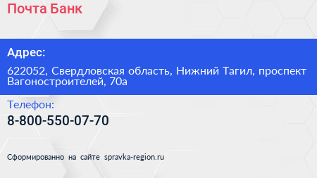 Почта Банк по адресу 622052, Свердловская область, Нижний Тагил, проспект Вагоностроителей, 70а в дальнейшем Организация, размещена в следующих категориях: