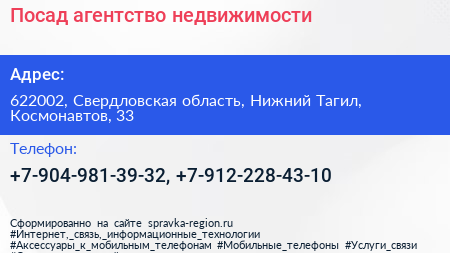 Посад, агентство недвижимости по адресу 622002, Свердловская область, Нижний Тагил, Космонавтов, 33 в дальнейшем Организация, размещена в следующих категориях: