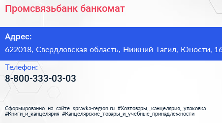 Промсвязьбанк, банкомат по адресу 622018, Свердловская область, Нижний Тагил, Юности, 16 в дальнейшем Организация, размещена в следующих категориях: