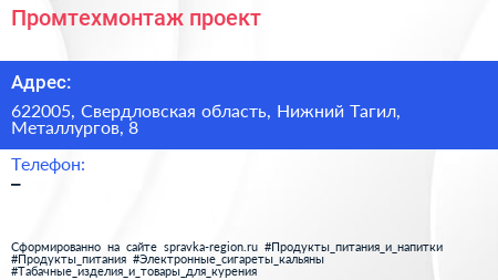 Промтехмонтаж проект по адресу 622005, Свердловская область, Нижний Тагил, Металлургов, 8 в дальнейшем Организация, размещена в следующих категориях: