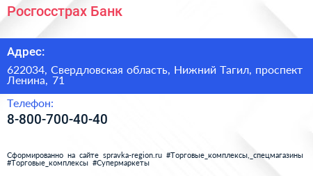 Росгосстрах Банк по адресу 622034, Свердловская область, Нижний Тагил, проспект Ленина, 71 в дальнейшем Организация, размещена в следующих категориях: