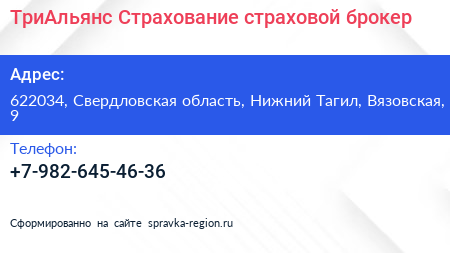 ТриАльянс Страхование, страховой брокер по адресу 622034, Свердловская область, Нижний Тагил, Вязовская, 9 в дальнейшем Организация, размещена в следующих категориях: