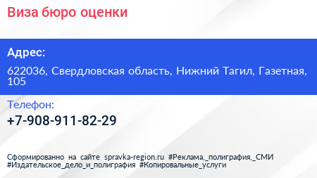 Виза, бюро оценки по адресу 622036, Свердловская область, Нижний Тагил, Газетная, 105 в дальнейшем Организация, размещена в следующих категориях: