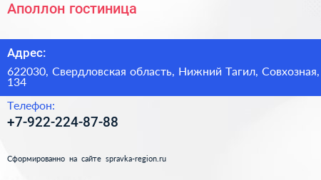 Аполлон, гостиница по адресу 622030, Свердловская область, Нижний Тагил, Совхозная, 134 в дальнейшем Организация, размещена в следующих категориях: