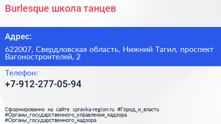 Burlesque, школа танцев по адресу 622007, Свердловская область, Нижний Тагил, проспект Вагоностроителей, 2 в дальнейшем Организация, размещена в следующих категориях: