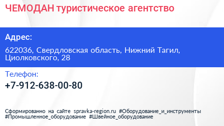 ЧЕМОДАН, туристическое агентство по адресу 622036, Свердловская область, Нижний Тагил, Циолковского, 28 в дальнейшем Организация, размещена в следующих категориях: