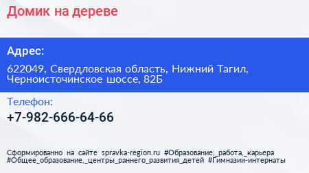 Домик на дереве по адресу 622049, Свердловская область, Нижний Тагил, Черноисточинское шоссе, 82Б в дальнейшем Организация, размещена в следующих категориях: