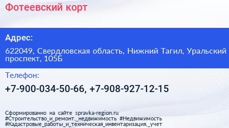 Фотеевский, корт по адресу 622049, Свердловская область, Нижний Тагил, Уральский проспект, 105Б в дальнейшем Организация, размещена в следующих категориях: