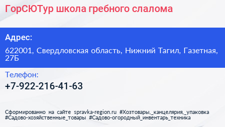 ГорСЮТур, школа гребного слалома по адресу 622001, Свердловская область, Нижний Тагил, Газетная, 27Б в дальнейшем Организация, размещена в следующих категориях: