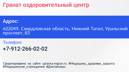 Гранат, оздоровительный центр по адресу 622049, Свердловская область, Нижний Тагил, Уральский проспект, 83 в дальнейшем Организация, размещена в следующих категориях: