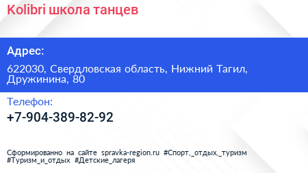 Kolibri, школа танцев по адресу 622030, Свердловская область, Нижний Тагил, Дружинина, 80 в дальнейшем Организация, размещена в следующих категориях: