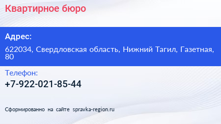 Квартирное бюро по адресу 622034, Свердловская область, Нижний Тагил, Газетная, 80 в дальнейшем Организация, размещена в следующих категориях: