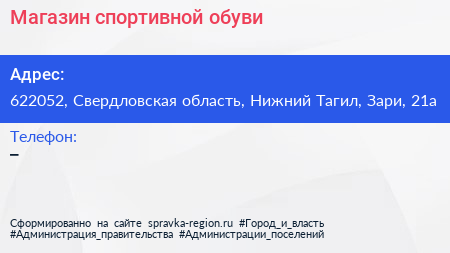 Магазин спортивной обуви по адресу 622052, Свердловская область, Нижний Тагил, Зари, 21а в дальнейшем Организация, размещена в следующих категориях: