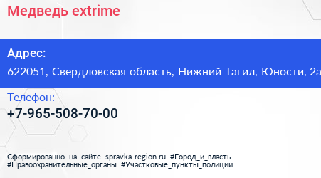 Медведь-extrime по адресу 622051, Свердловская область, Нижний Тагил, Юности, 2а в дальнейшем Организация, размещена в следующих категориях: