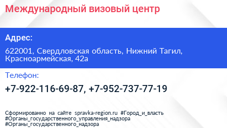 Международный визовый центр по адресу 622001, Свердловская область, Нижний Тагил, Красноармейская, 42а в дальнейшем Организация, размещена в следующих категориях: