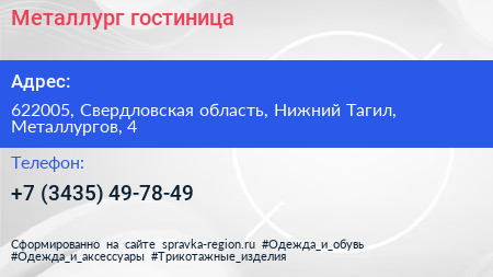 Металлург, гостиница по адресу 622005, Свердловская область, Нижний Тагил, Металлургов, 4 в дальнейшем Организация, размещена в следующих категориях: